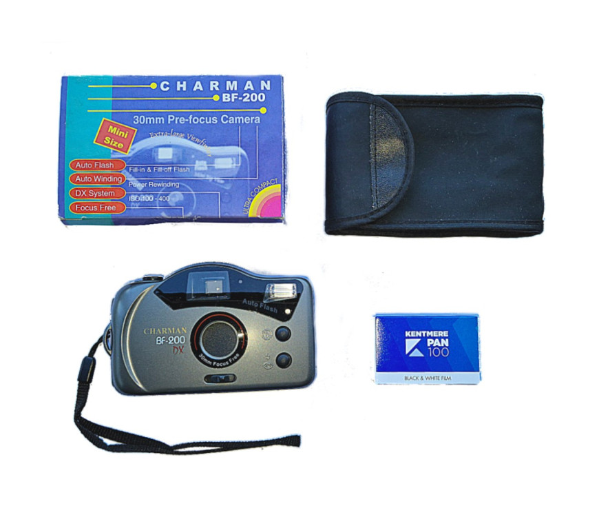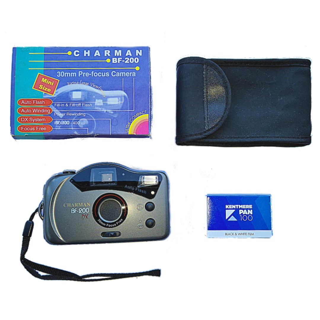 Preprost analogni 35 mm fotoaparat Charman BF-200 DX z fiksnim širokokotnim objektivom (~30 mm) in z možnostjo upravljanja bliskavice – idealen za začetnike in nostalgike.