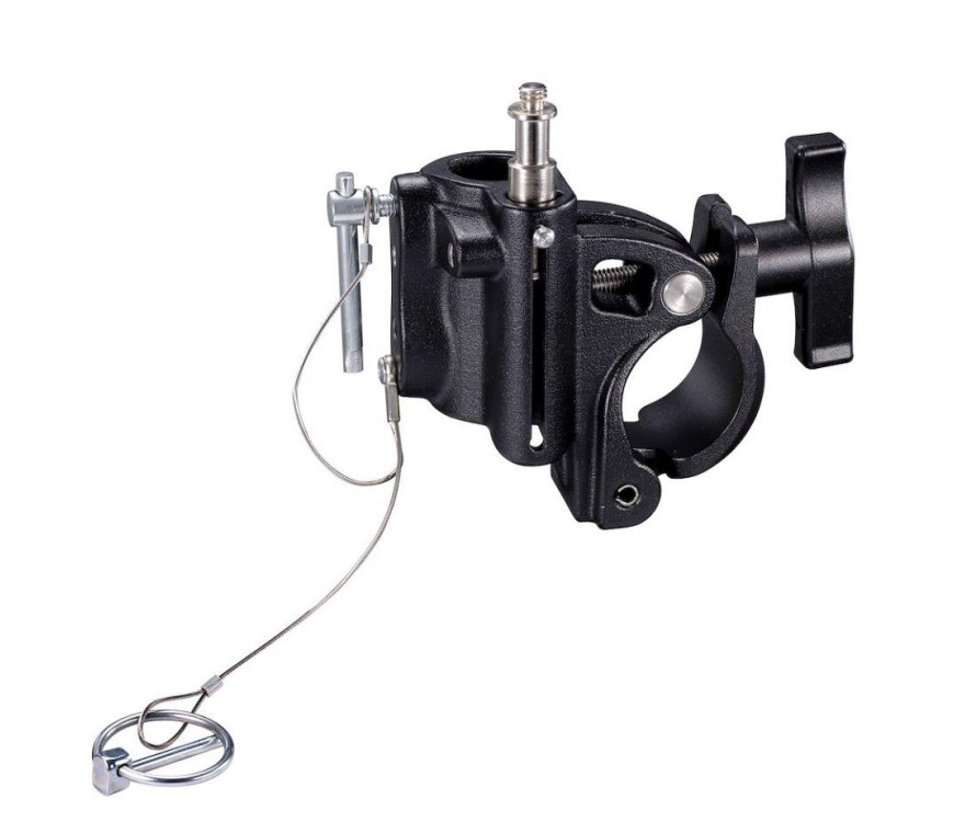 This aluminium gravity casting black Barrel Clamp works on diameters from 42mm to 52mm. It holds a payload of 40kg on a 16mm attachment and 600kg on a 28mm attachment. The clamp is Tuv Sud certified for maximum security for the user. It features 3 attachments: 5/8'' (16 mm) bushing, 1'' 1/8 (28 mm) bushing, and a 5/8'' (16 mm) spigot. This clamp is extremely strong, featuring a knob locking mechanism for easy operation, and it includes a safety cable.