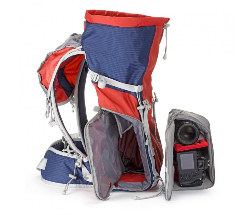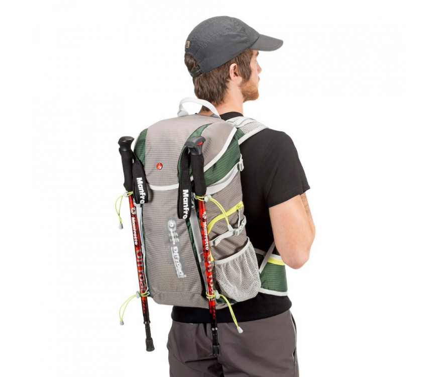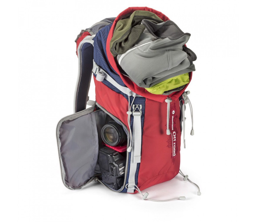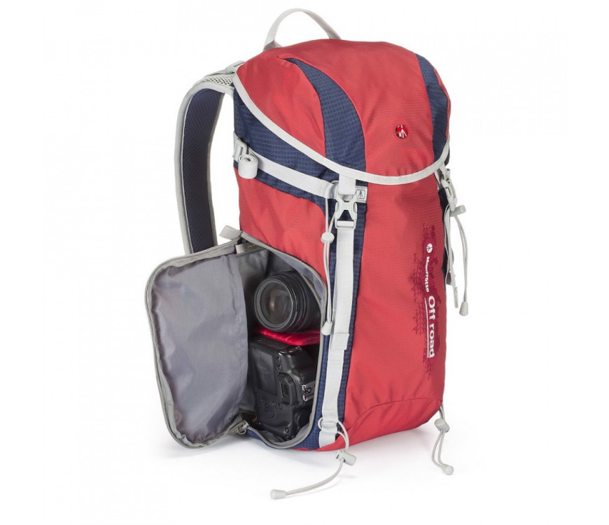 Manfrotto Off road nahrbtnik je najboljša rešitev za pohodništvo in fotografiranje brez kompromisov, ker nudi tako prostor za osebne stvari, kot tudi za foto opremo zahvaljujoč odstranljivega žepa v katerega lahko pospravimo pro DSLR fotoaparat s pritrjenim objektivom, dodatna dva objektiva in dodatki. Če odpremo notranjo delilno steno in odstranimo žep za fotoaparat, se lahko nahrbtnik uporabi kot normalen pohodniški nahrbtnik. Poleg tega pa nam nahrbtnik omogoča edinstveno rešitev za pritrditev fotoaparata na prsi, da se prepreči pritisk na vratu in imamo fotoaparat vseeno v dosegu roke. Zahvaljujoč posebnih trakov imamo možnost pritrditve na nahrbtnik tako pohodniške palice kot tudi trinožno stojala.