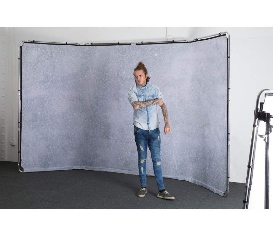 Manfrotto Limestone panoramska prevleka za ozadje za uporabo s samonosnim panoramskim okvirjem ozadja (okvir ni priložen). Z močnimi sponkami, ki jih je enostavno pritrditi, je mogoče tekstilni pokrov hitro pritrditi na okvir in ga odstraniti. Ozadje je je pritrjeno tako tesno, da se ne pojavijo gube. Granitna prevleka ponuja učinek kamnite površine z razponom sivih tonov in temnimi vinjetami na robovih.