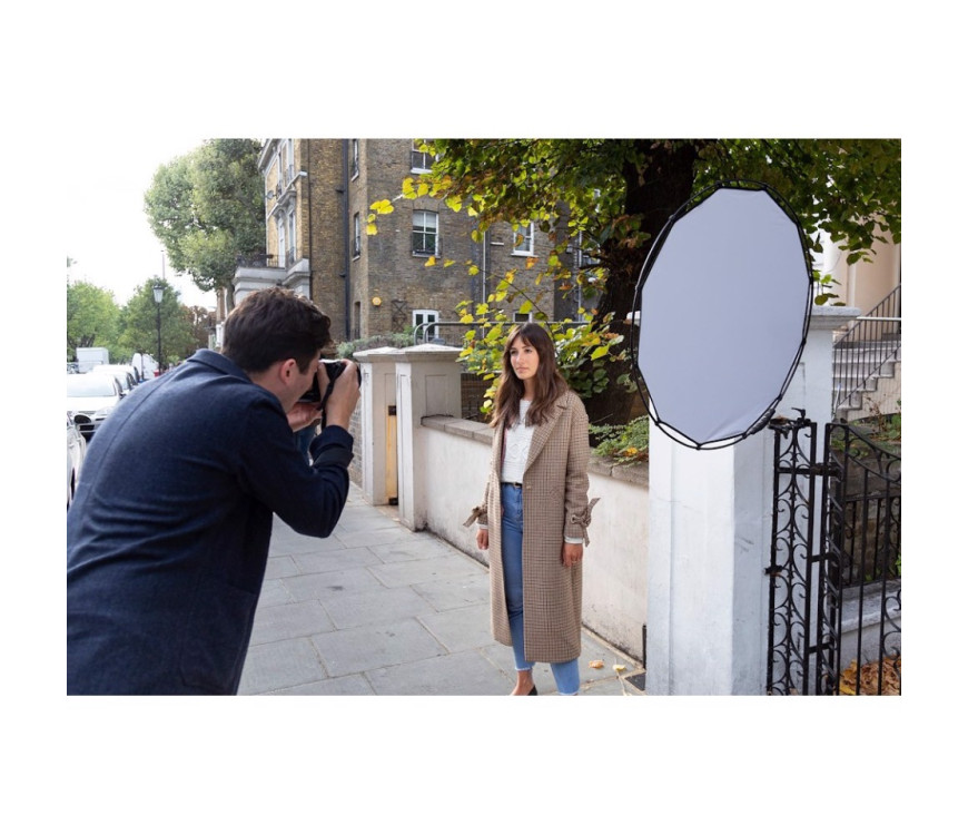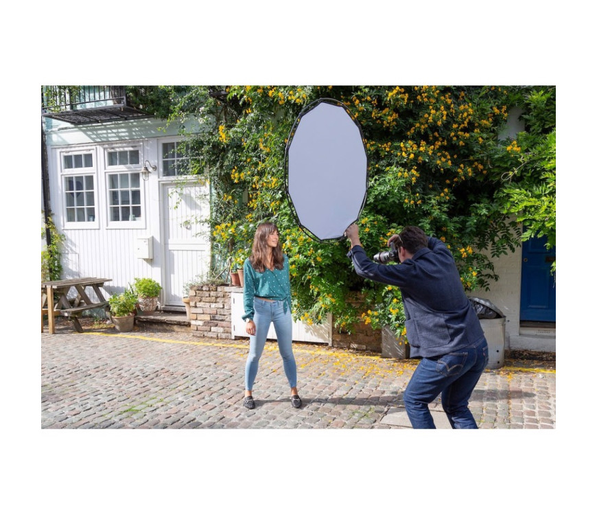 Manfrotto HaloCompact odbojnik s premerom 82 cm v srebrno/beli barvi ima popolnoma nov, patentiran koncept oblikovanja, ki še olajša vsakodnevno uporabo reflektorjev! V nasprotju z običajnimi modeli reflektorjev/difuzorjev z jeklenim okvirjem ima 82 cm HaloCompact inovativno tehnologijo RapidExoframe™, ki jo je razvil Manfrotto pri Manfrotto: zložljiv aluminijast okvir je mogoče hitro sestaviti in pokrov reflektorja ali difuzorja enostavno pritrditi pritrdite sponke. . Ko je zapakiran, kompaktni komplet meri le 6,5 × 27 × 6,5 cm in tehta le 390 g, vključno s torbico. HaloCompact je odlična izbira za fotografe, ki veliko potujejo in imajo le omejen prostor za svojo opremo. Reflektor/difuzor lahko enostavno shranite v torbico za fotoaparat ali ga pritrdite na zunanjo stran nahrbtnika ali oblačila z majhnim vponkom na torbici. Novi reflektor/difuzor je opremljen z ergonomskim ročajem, ki nudi varen oprijem in omogoča optimalno poravnavo reflektorja/difuzorja z eno roko. Ročaj ima praktičen navoj 1/4” (vključno z adapterjem 1/4” do 3/8”), s katerim ga je mogoče pritrditi na vse standardne nosilce in stojala. Reflektor HaloCompact ima srebrno in belo barvo; difuzor HaloCompact zmanjša svetlobo za dve stopnji f.