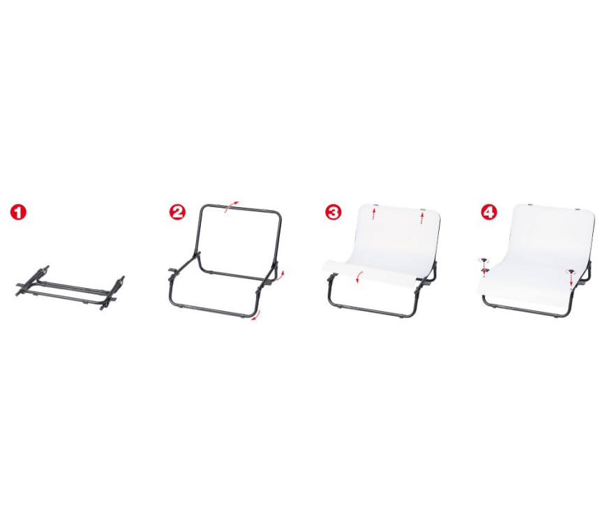 Studijska miza- Sestavljen je iz mize za fotografiranje (5845) in dveh LED namiznih luči (2 x 5850). Kompaktna snemalna miza za fotografiranje majhnih predmetov brez motečega ozadja. Sestavljen je iz zložljivega cevastega jeklenega okvirja in bele prosojne plastične plošče z vnaprej oblikovanim sprednjim robom. Enostavna postavitev in odstranitev brez orodja, shranjevanje, ki prihrani prostor. Osnovni okvir z nedrsečimi nogami. Dodatke (luči, gosji vrat itd.) lahko pritrdite s stranskimi sponkami z dvema pritrdilnima vijakoma. Raven delovni prostor na mizi: pribl. 61 x 35 cm (24,0 x 13,8 in.). Višina ozadja: pribl. 35 cm (13,8 in.). 19 cm (7,5 in.) prostega prostora pod mizo za vir prepustne svetlobe (light box). Skupne mere: (ŠxVxG): 71 x 53 x 65 cm (28,0 x 20,9 x 25,6 in.). Teža: pribl. 2,9 kg (6,4 lbs.). Dve kompaktni svetlobni plošči za dnevno svetlobo za mehko in enakomerno osvetlitev. Vsebuje 96 LED diod z visokim CRI v tankem ohišju. Vključuje vrtljivi zglob s 3 zaskočnimi sklepi in nastavljivo nogo. Plošča 14 x 20 cm (5,5 x 7,9 in.) z difuzorskim zaslonom. Odlična kakovost osvetlitve z uporabo izbranih LED diod z visokim indeksom barvnega upodabljanja (CRI) 95. Svetloba brez utripanja, brez infrardeče in UV vsebine. Barvna temperatura 5600 Kelvinov (dnevna svetloba/nevtralno barvno upodabljanje). Vsaka plošča z največjo osvetlitvijo 480 luksov na razdalji 1 m (3 ft.) in posebej širokim kotom sevanja 110° (kot polovične vrednosti). Luč lahko individualno pozicionirate po višini in naklonu preko treh zaskočnih spojev na nosilcu. Stranske palice stopala lahko postavite posamično, da dosežete varno stojalo. Noga se lahko zloži za shranjevanje. Največja višina z nogo in nosilcem na tečajih: 48 cm (18,9 in.) Napajanje preko električnega kabla s kabelskim stikalom. Delovna napetost: 110 – 240 V Poraba energije: 2 x 18 W