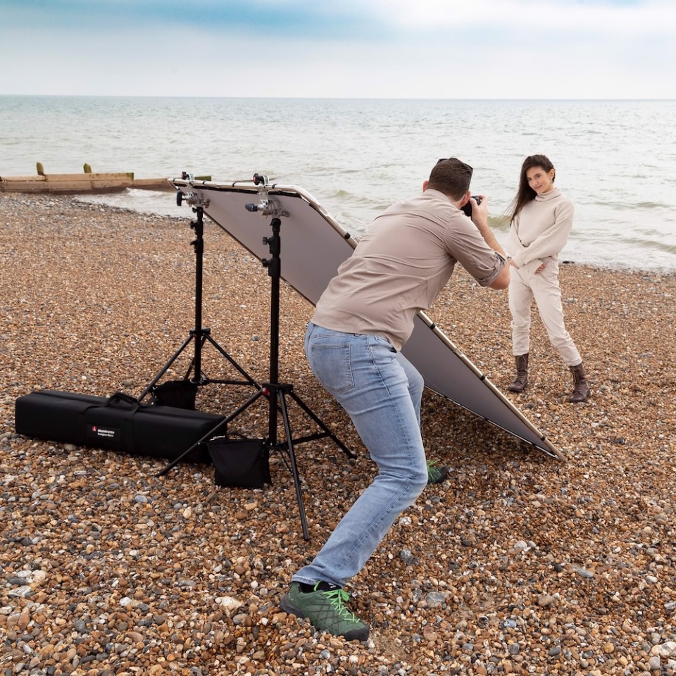 Čas nastavitve tega kompleta traja le nekaj minut, zahvaljujoč hitrem sestavljanju lahkega aluminijastega okvirja z notranjo elastično vrvico, ki zagotavlja, da vsi deli ogrodja ostanejo skupaj. Inovativni sponki na tekstilnih prevlekah so še en prihranek časa, saj jim omogoča hitro in enostavno pritrditev neposredno na okvir. Prehod na nadomestni tekstilni ovitek ne bi mogel biti enostavnejši, enostavno odpnite pritrjeni pokrov in nato pritrdite še enega naravnost na okvir, pri čemer ni potreben zamuden bungee kabelski sklop. Poleg tega trdi ohišji zadrgajo notranji predel in trakovi na ježki, da je vse varno na svojem mestu, pripravljeno za naslednje snemanje.
