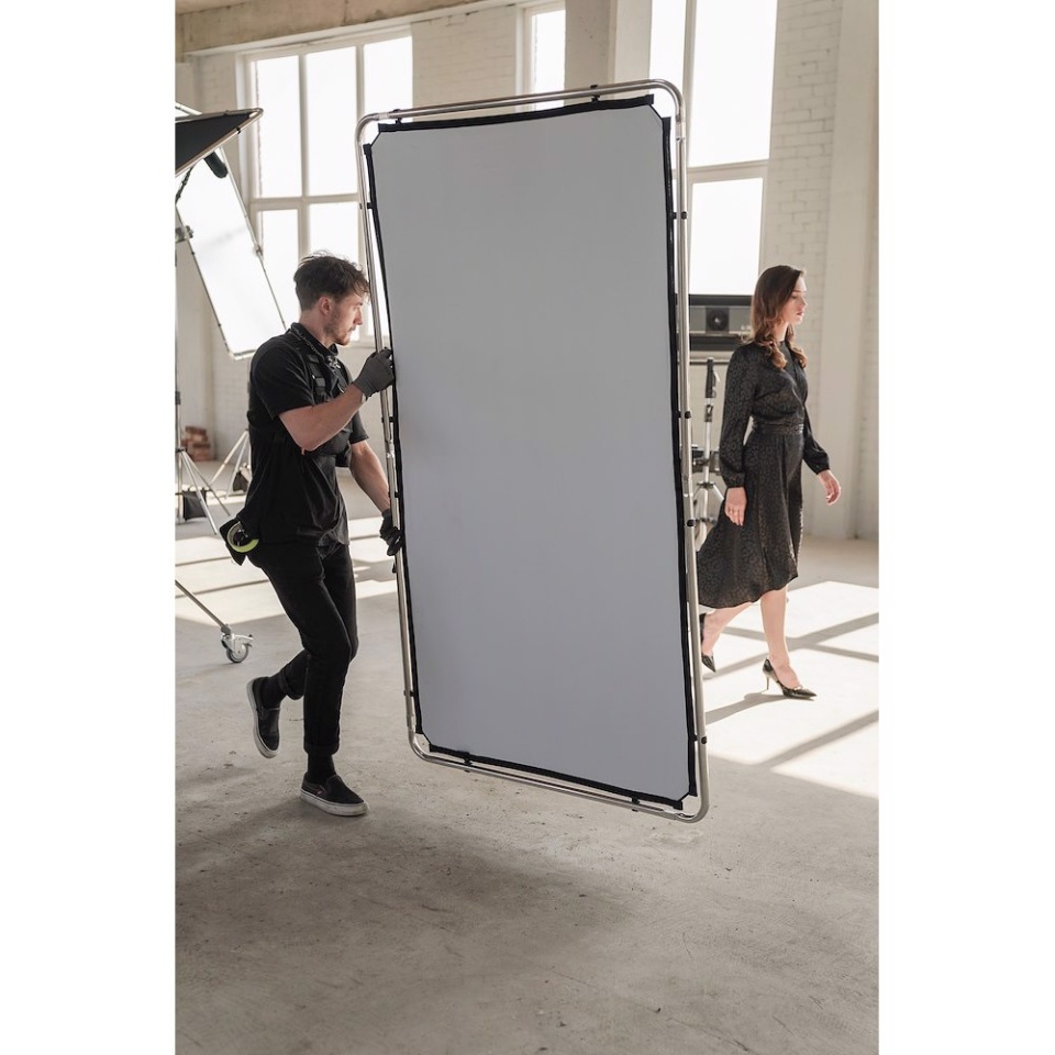 Manfrotto Pro Scrim All In One Kit 1,1 x 2 m Medium vključuje: 1x lahek okvir, 3x tekstilne prevleke; (črna, dvostranski srebrno-beli odbojen in difuzor 1,25 stop), 2x nosilna glava in torba.
