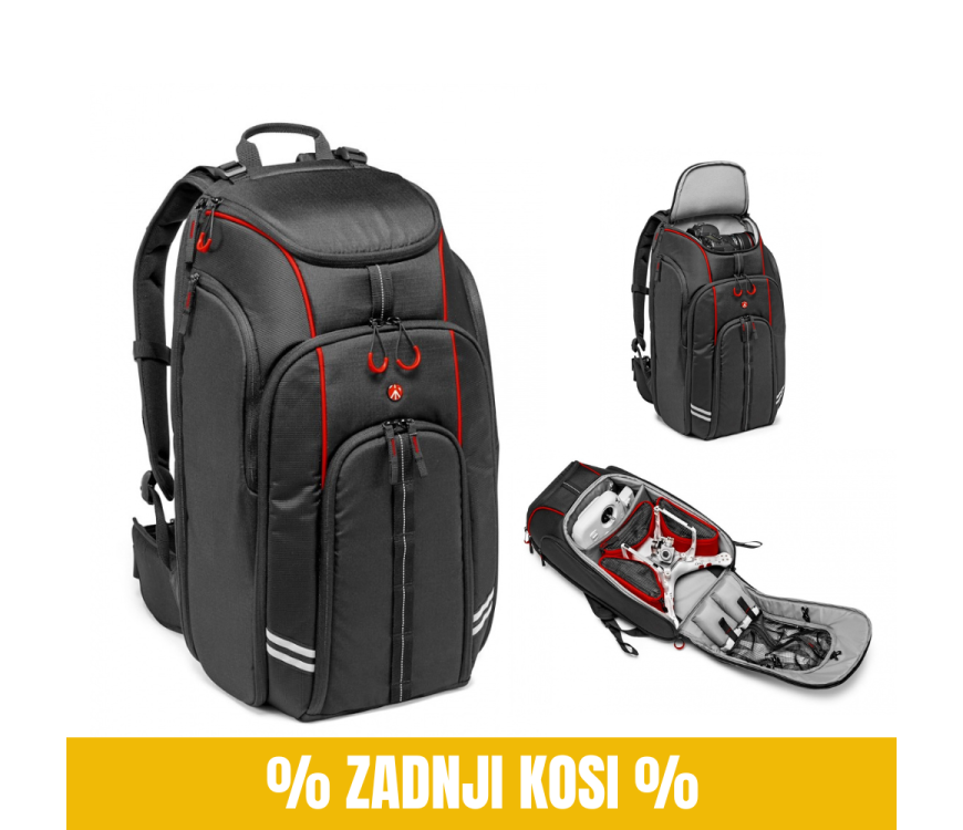 Manfrotto nahrbtnik za drone D1 je nova rešitev za nošenje, zasnovana posebej za pilote dron, ki želijo varno pospraviti svoje drone in dodatke ter biti izjemno mobilni pri svojih dinamičnih opravilih. Idealen za serijo DJI Phantom, vključno z novimi modeli DJI Phantom 3 & 4, ta nahrbtnik ponuja tudi prostor za fotoaparat DSLR z objektivom in stojalom. 3 rdeči Manfrotto zaščitni delilniki se tesno prilegajo dronu in opremi ter varno ščitijo vsebino. Neodvisni oddelki za oddajnike, propelerje in baterije omogočajo dobro strukturirano razporeditev opreme. To je popolna rešitev za vse v enem, ki vam pomaga snemati video z dronom in snemati prizore za zakulisji s stojalom in fotoaparatom. Nahrbtnik je bil zasnovan po najnovejši zasnovi quadcopterja. Manfrotto nahrbtnik je zelo lahek, vodo-odbojen in ponuja veliko prostora. V primerjavi z drugimi nahrbtniki za drone na trgu je Manfrotto D1 kot nalašč za zunanjo uporabo, kjer je ključna mobilnost. Pametna zunanja možnost pritrditve omogoča pritrditev drona z nameščenimi propelerji na zunanji strani nahrbtnika s preprostim odpiranjem sprednje zadrge. Zaradi tega je uporaba še posebej hitra in jo lahko shranite prav tako hitro. Še posebej koristno je, če hitro spremenite lokacijo in in vam ni potrebo vsakič razstaviti drona. Nahrbtnik vsebuje tudi poseben predal za prenosnik do 17“ in tablični računalnik, tako da lahko takoj preverite svoje delo in ga v realnem času delite z drugimi. V slabem vremenu uporabite zaščitno prevleko za zaščito celotnega nahrbtnika. Manfrotto nahrbtnik D1 Drone, znan po svojem stilskem in domiselnem dizajnu, je prejel "Honourable Mention" od sodnikov Red Dot, mednarodne ekipe strokovnjakov za dizajn.